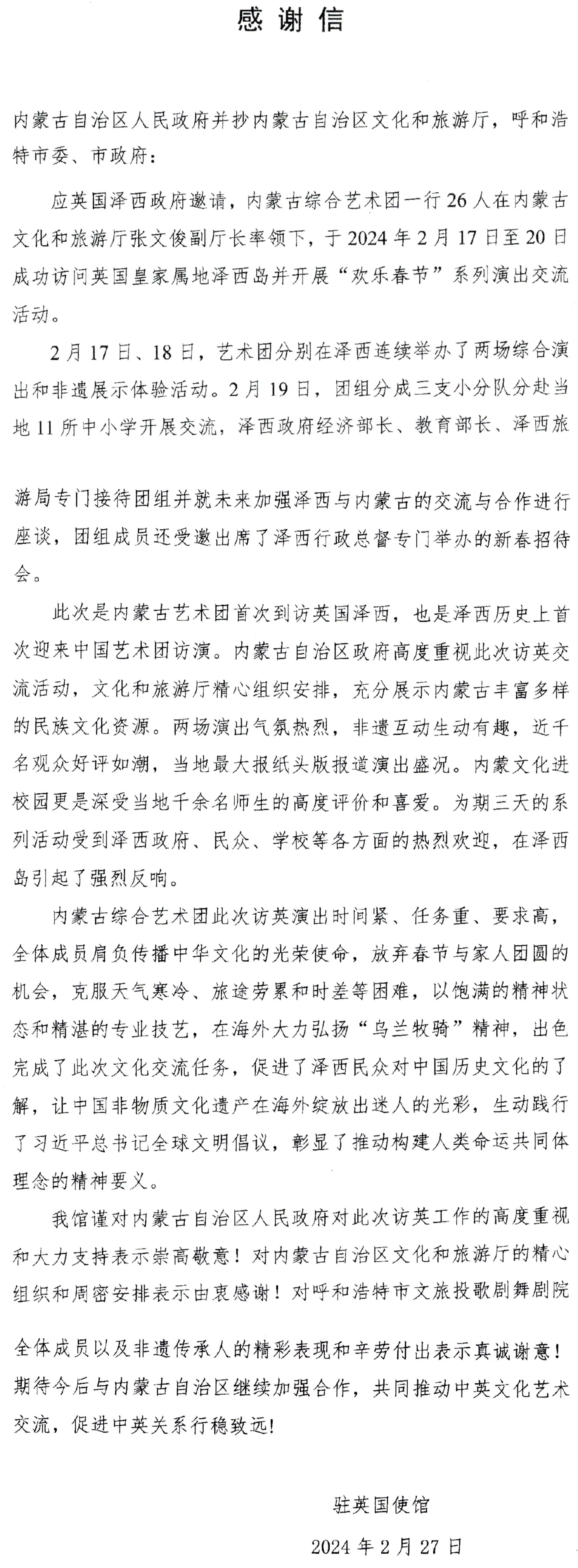 3月初收到駐英國使館感謝信,信中提到,此次內(nèi)蒙古綜合藝術(shù)團(tuán)是英國澤西島歷史上首次迎來的中國藝術(shù)團(tuán),兩場演出活動好評如潮,在當(dāng)?shù)刈畲髨蠹堫^條報道。內(nèi)蒙古文化進(jìn)校園更深受當(dāng)?shù)厍в嗝麕熒母叨仍u價和喜愛。出訪團(tuán)在訪英演出時間緊、任務(wù)重、要求高,全體演職人員肩負(fù)傳播中華文化的光榮使命,以飽滿的精神狀態(tài)和精湛的專業(yè)技藝,在海外大力弘揚(yáng)“烏蘭牧騎”精神,出色完成各項(xiàng)文化交流任務(wù),生動踐行了習(xí)近平總書記全球文明倡議,彰顯了推動構(gòu)建人類命運(yùn)共同體理念的精神要義。