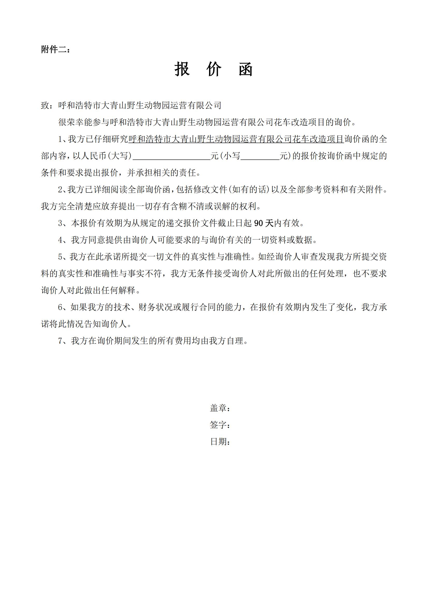 呼和浩特市大青山野生動物園運(yùn)營有限公司花車改造項(xiàng)目詢價(jià)函